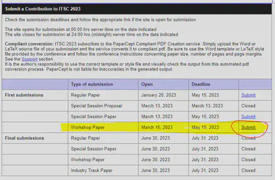 To submit your workshop paper, please use the PaperCept platform by IEEE-ITSC 2023